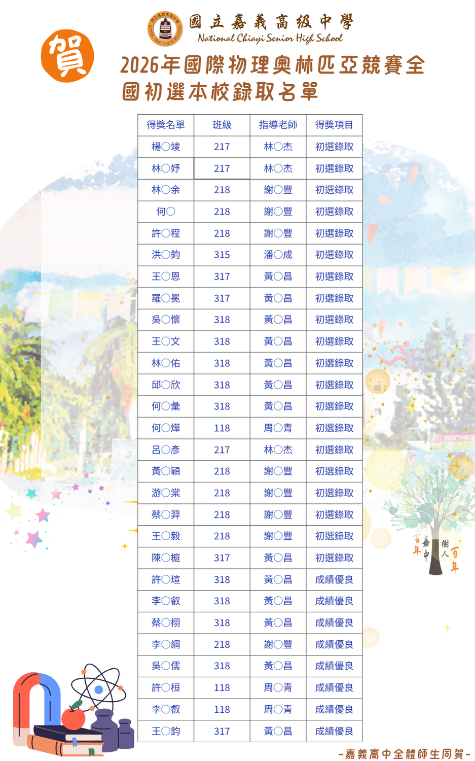 恭喜! 2026年物理奧林匹亞初選,本校共計20名同學入選錄取;另獲成績優良者有8人,名單如下表。恭喜入選及成績優良同學,感謝老師辛勤指導!