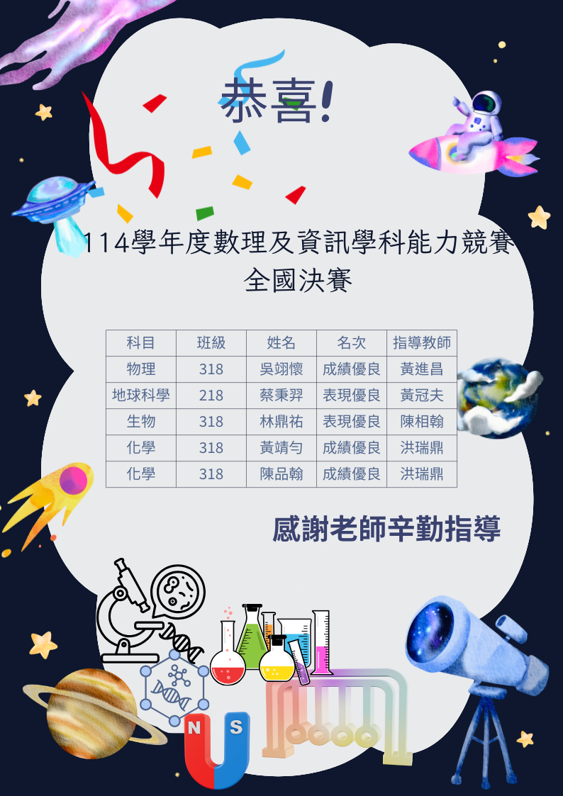 恭喜!114學年度學科能力競賽全國決賽本校選手表現優異