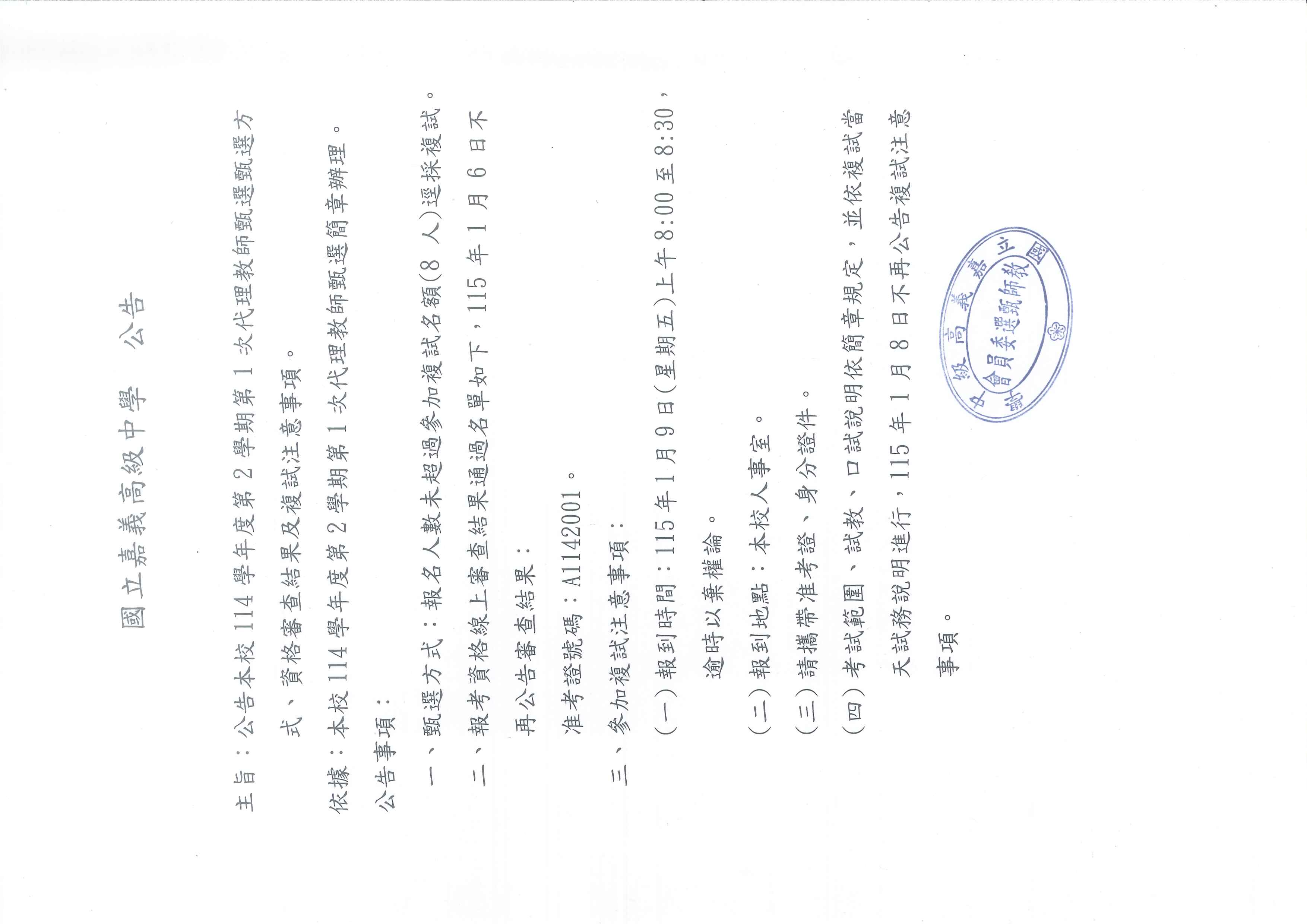 公告本校114學年度第2學期第1次代理教師甄選甄選方式、資格審查結果及複試注意事項