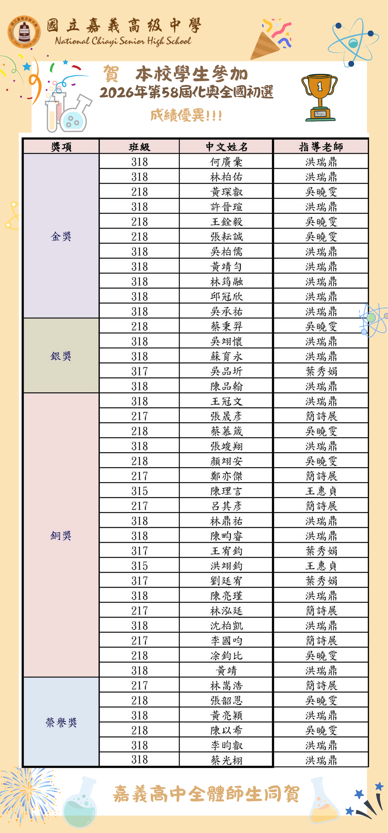 賀!2026年化學奧林匹亞初賽,本校榮獲佳績!!