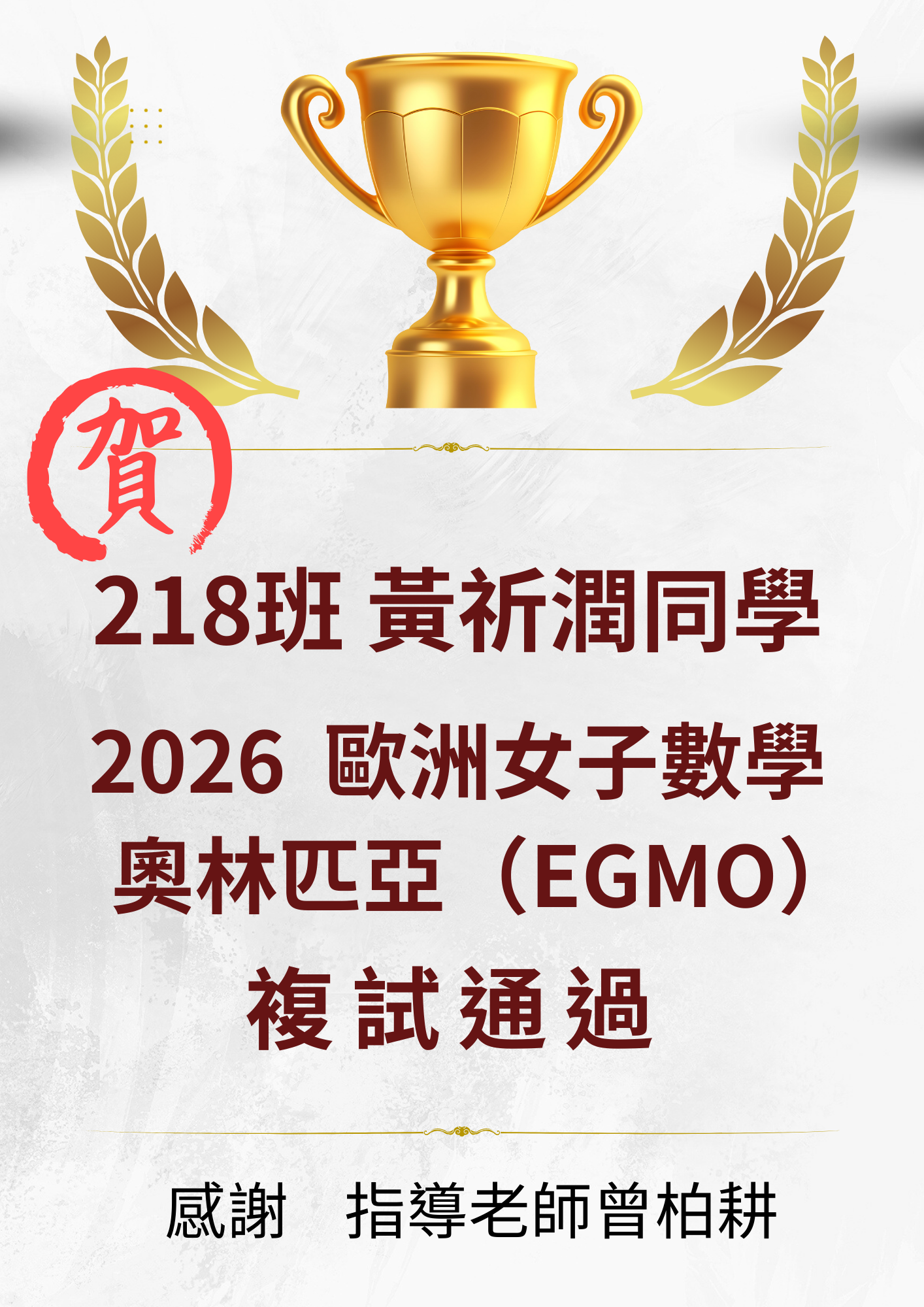 恭喜本校218班黃祈潤同學通過歐洲女子數學奧林匹亞(EGMO)複試