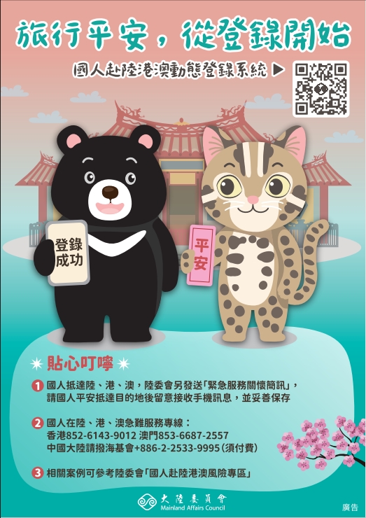 檢送大陸委員會製作之「旅行平安,從登錄開始」宣導海報1份,請同仁瞭解及使用「國人赴陸港澳動態登錄系統」。