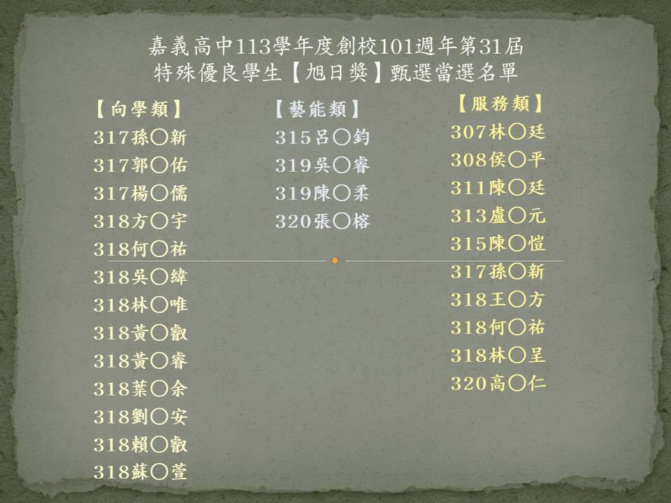 嘉義高中112學年度創校100週年第30屆特殊優良學生【旭日獎】甄選當選名單