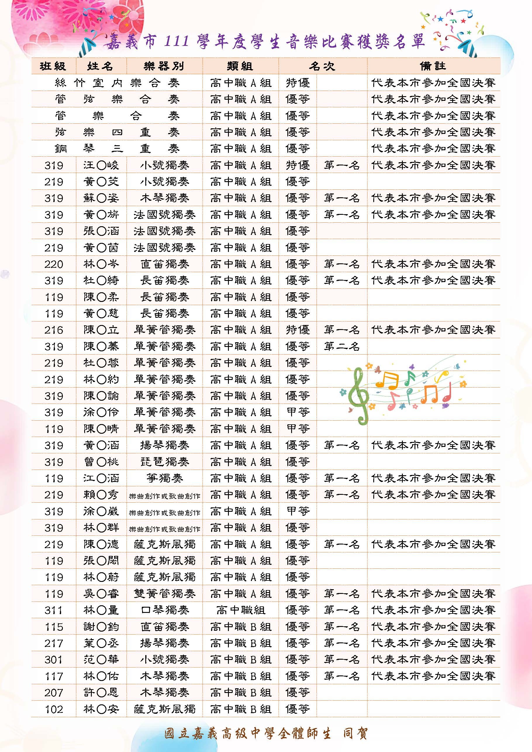 嘉義市111學年度學生音樂比賽獲獎名單